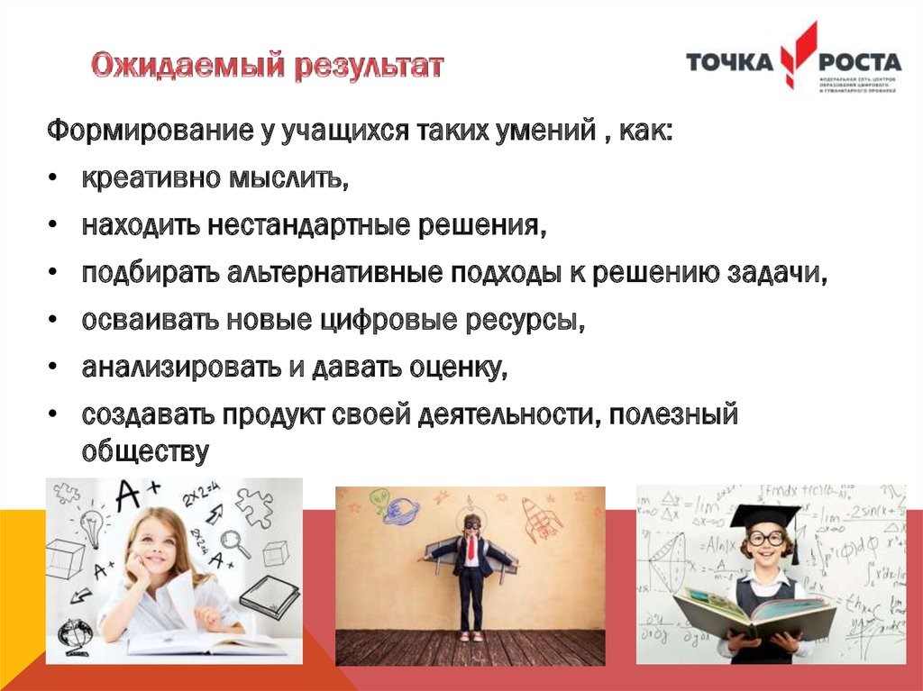 Кроме этого, центры «Точка роста» могут выступать в роли общественного пространства для развития цифровой грамотности, творческой, проектной деятельности и другой познавательной и социальной активности учеников школы, их родителей, учителей, а также местных жителей.