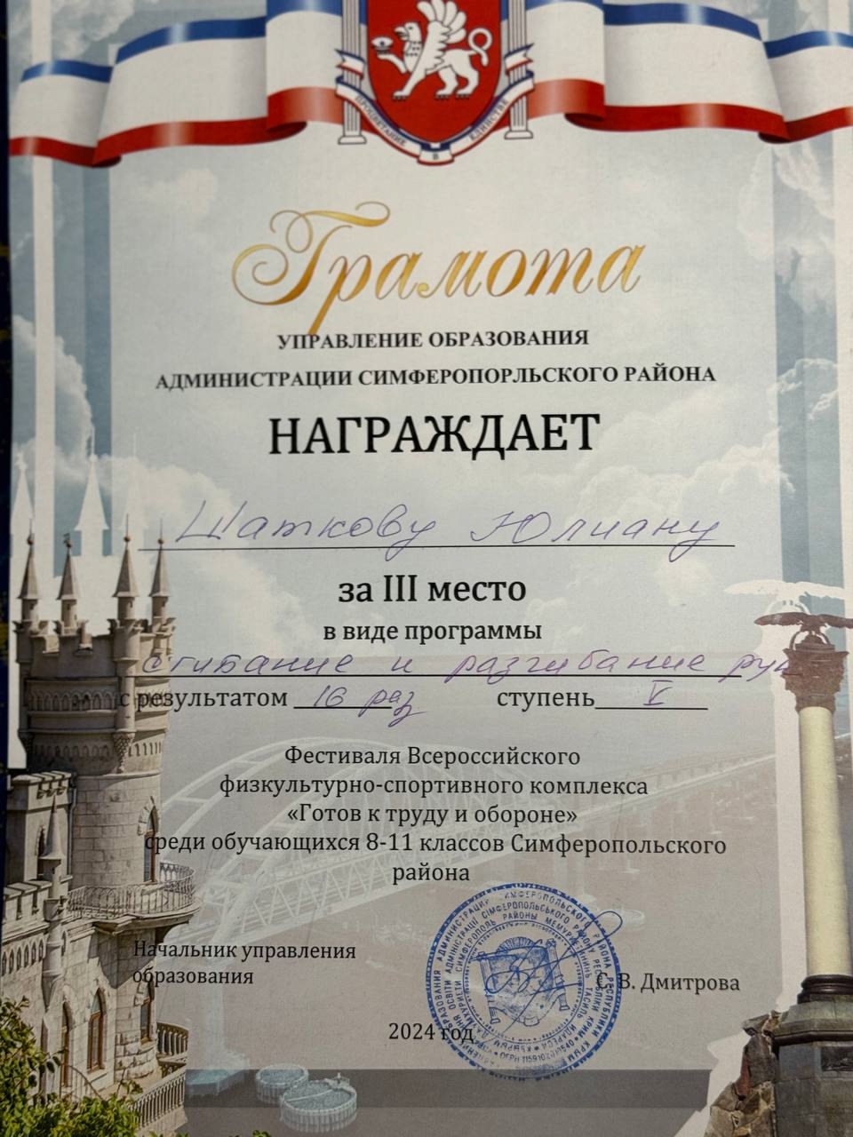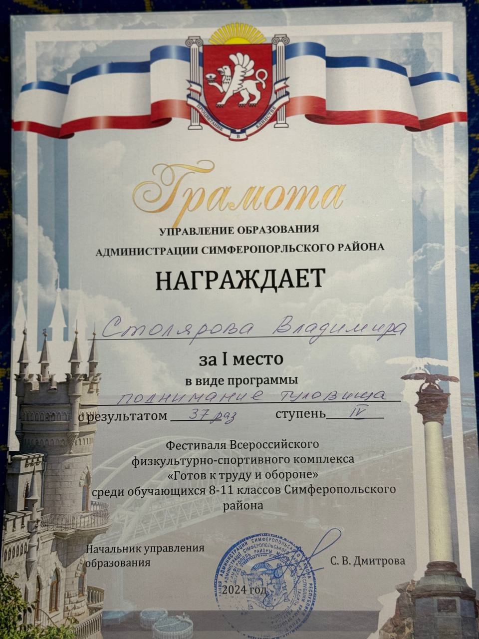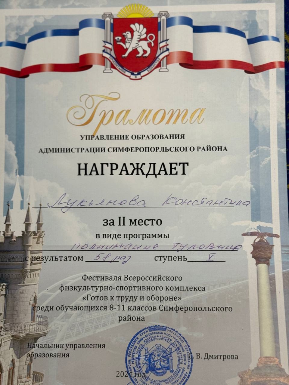 8 ноября 2024 года в МБОУ «Лицей Крымской весны» прошел Фестиваль ВФСК ГТО среди обучающихся 8-11 классов Симферопольского района. За нашу школьную команду выступили: Куманский Даниил, Лукьянов Константин, Хорошилов Егор, Эмирусеинов Юнус, Эмирусеинов Юсуф, Столяров Владимир, Шаткова Юлиана, Коротаев Александр, Трусов Георгий, Фасхутдинов Данис. Ребята состязались в четырех видах испытаний: