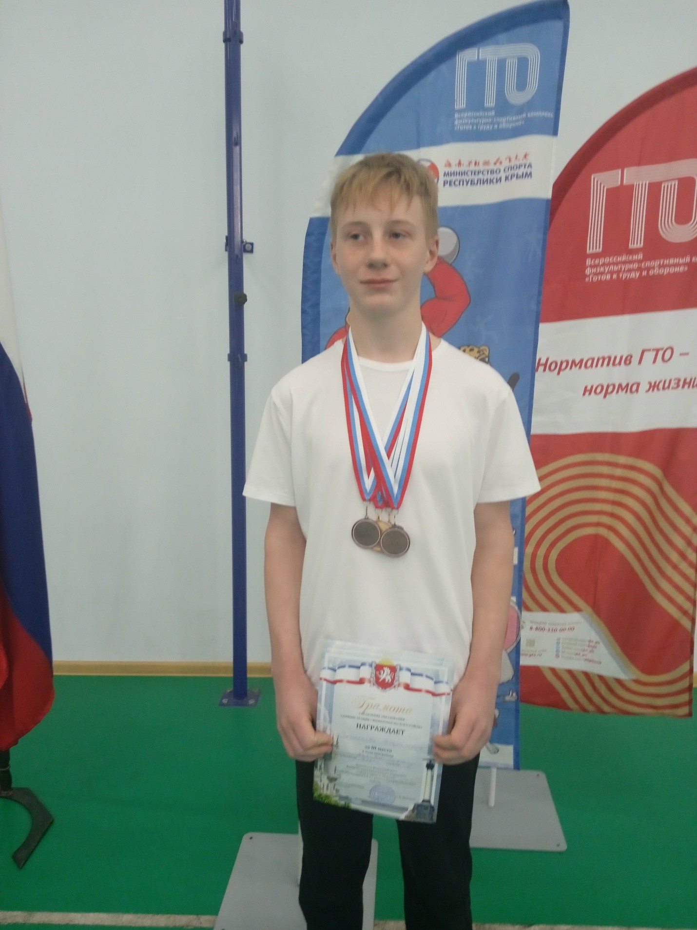 Столяров Владимир получил четыре медали за все виды соревнований: 3 место в беге на 1.5 км., 2 место в сгибании и разгибании рук, 3 место в челночном беге, 1 место в поднимании туловища.